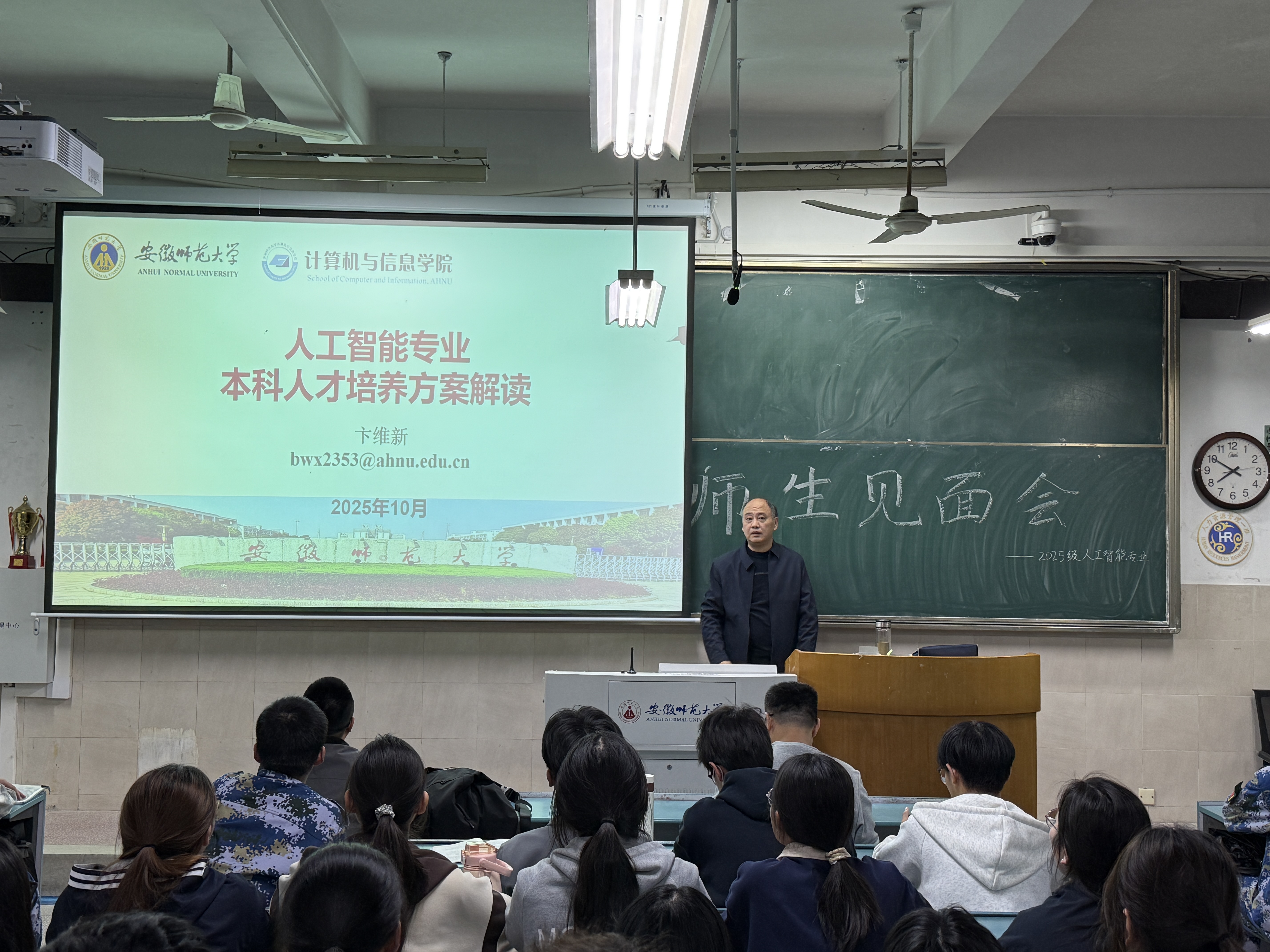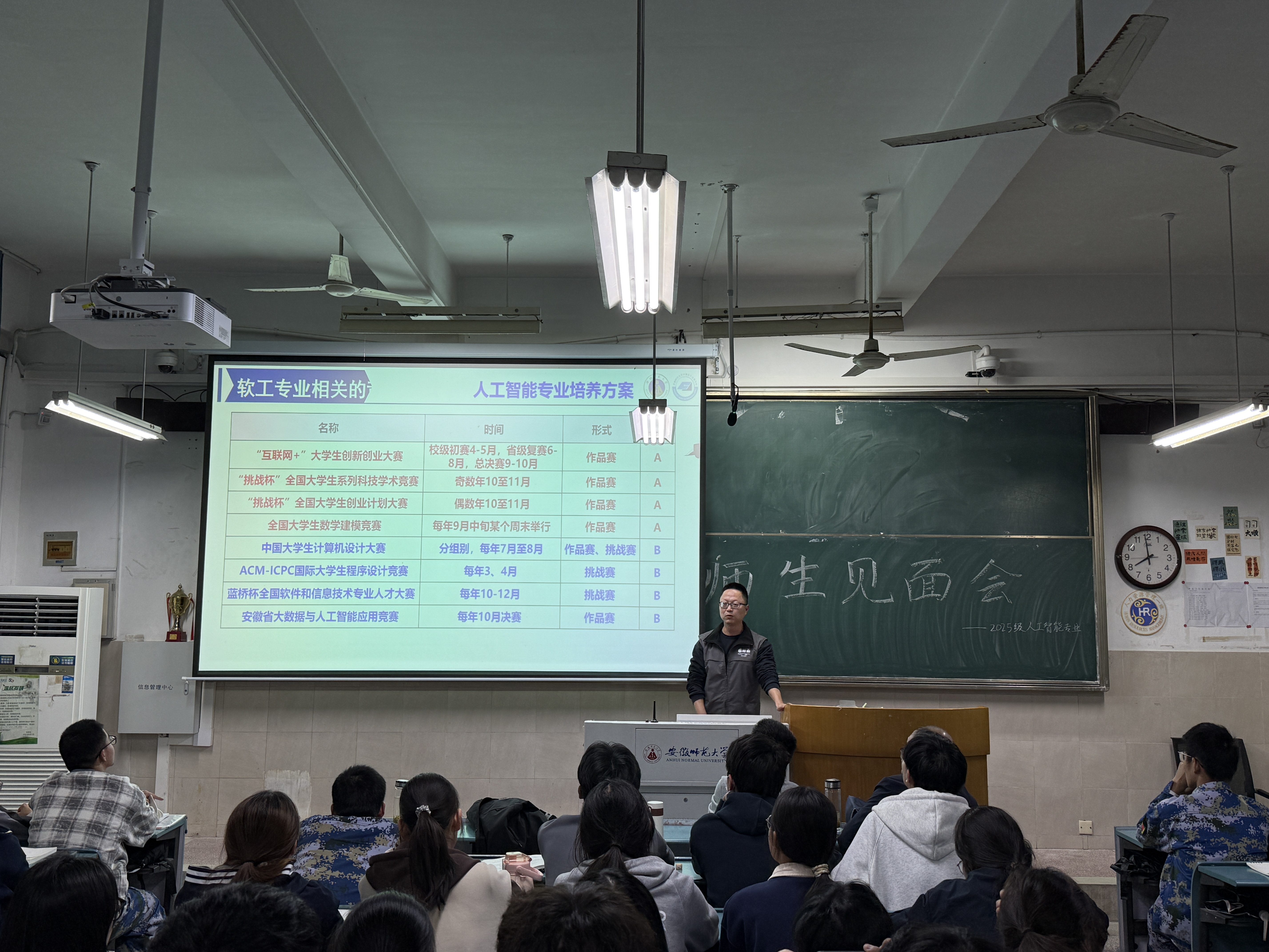 为帮助2025级新生洞悉人工智能前沿动态、规划学业发展蓝图,10月20日晚,2025级人工智能专业于2020102教室举办人才培养方案解读会和师生见面会。人工智能专业负责人卞维新主任、专任教师赵诚、杨杨和奋发向上的2025级新生共同参会,齐聚一堂,一道擘画智能时代的未来新篇。