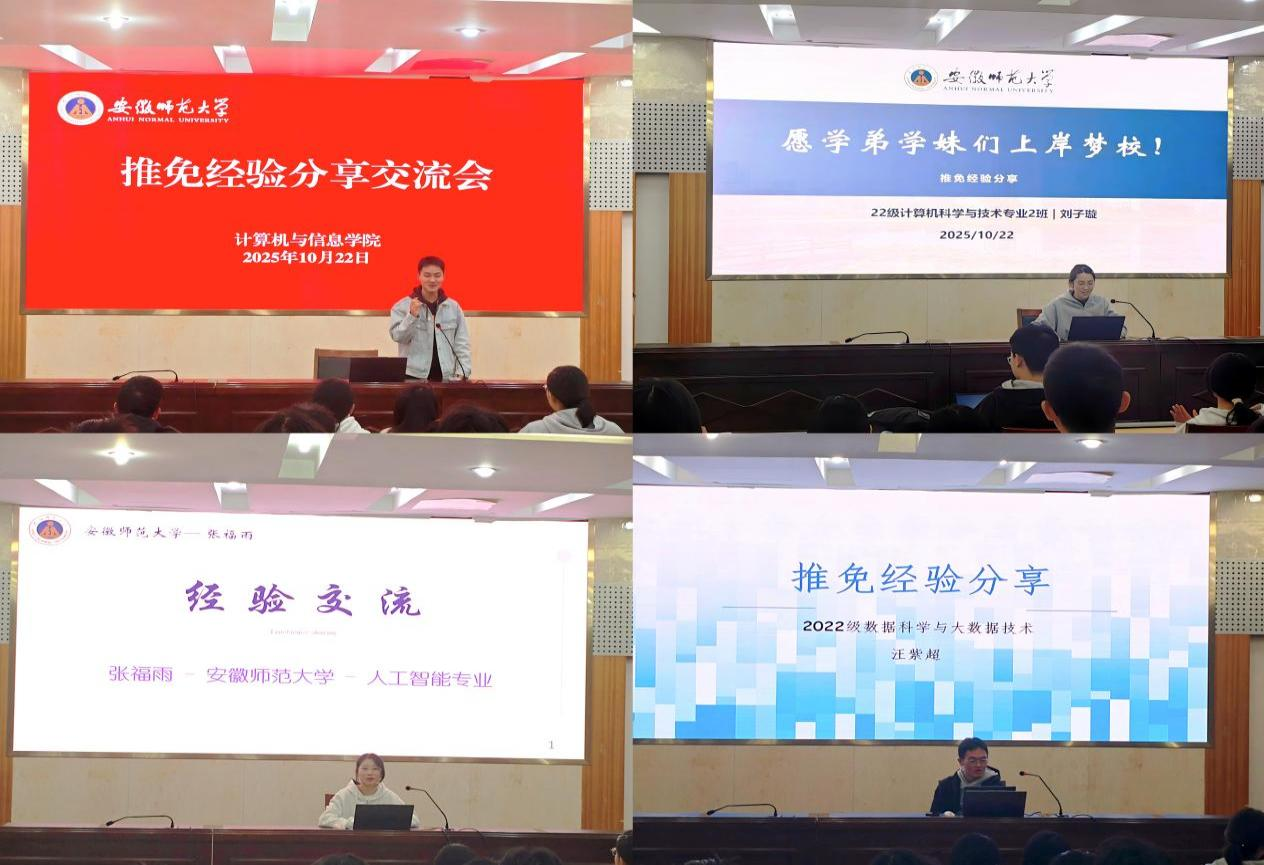 为帮助2023级同学深入了解推免政策、掌握面试技巧、明确个人发展规划,计算机与信息学院于10月22日晚在学苑北楼8号楼副二楼报告厅成功举办推免经验交流分享会。本次活动由2023级辅导员盛杰老师主持,特邀7位2022级优秀推免生代表参与分享,涵盖计算机科学与技术、人工智能、数据科学与大数据技术、软件工程、网络空间安全及物联网工程六个专业。活动采用线上线下相结合的方式,吸引了各专业有推免意向的同学踊跃参与。