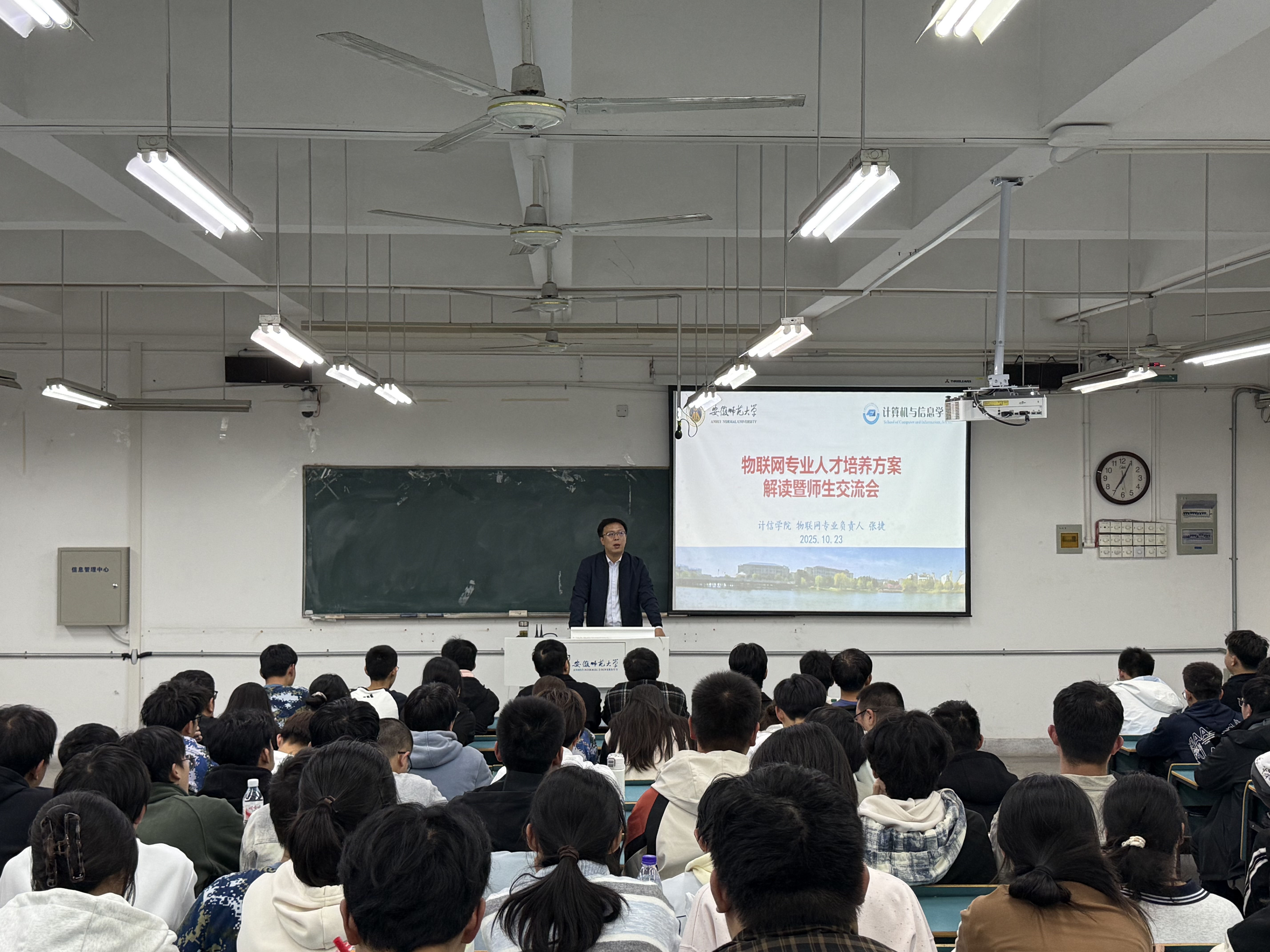 为帮助 2025 级新生精准把握专业定位、明晰成长路径,2025年10月23日,计算机与信息学院在2070101教室成功举办2025级物联网工程专业人才培养方案解读暨师生交流会。物联网专业负责人张捷老师围绕专业发展、课程体系、实践平台与学业发展路径,为新生带来了一场内容丰富、导向明确的人才培养解读会。本次解读会特别突出“魅力导师团”的引领作用,展现学院在个性化培养与全程化育人方面的积极探索。