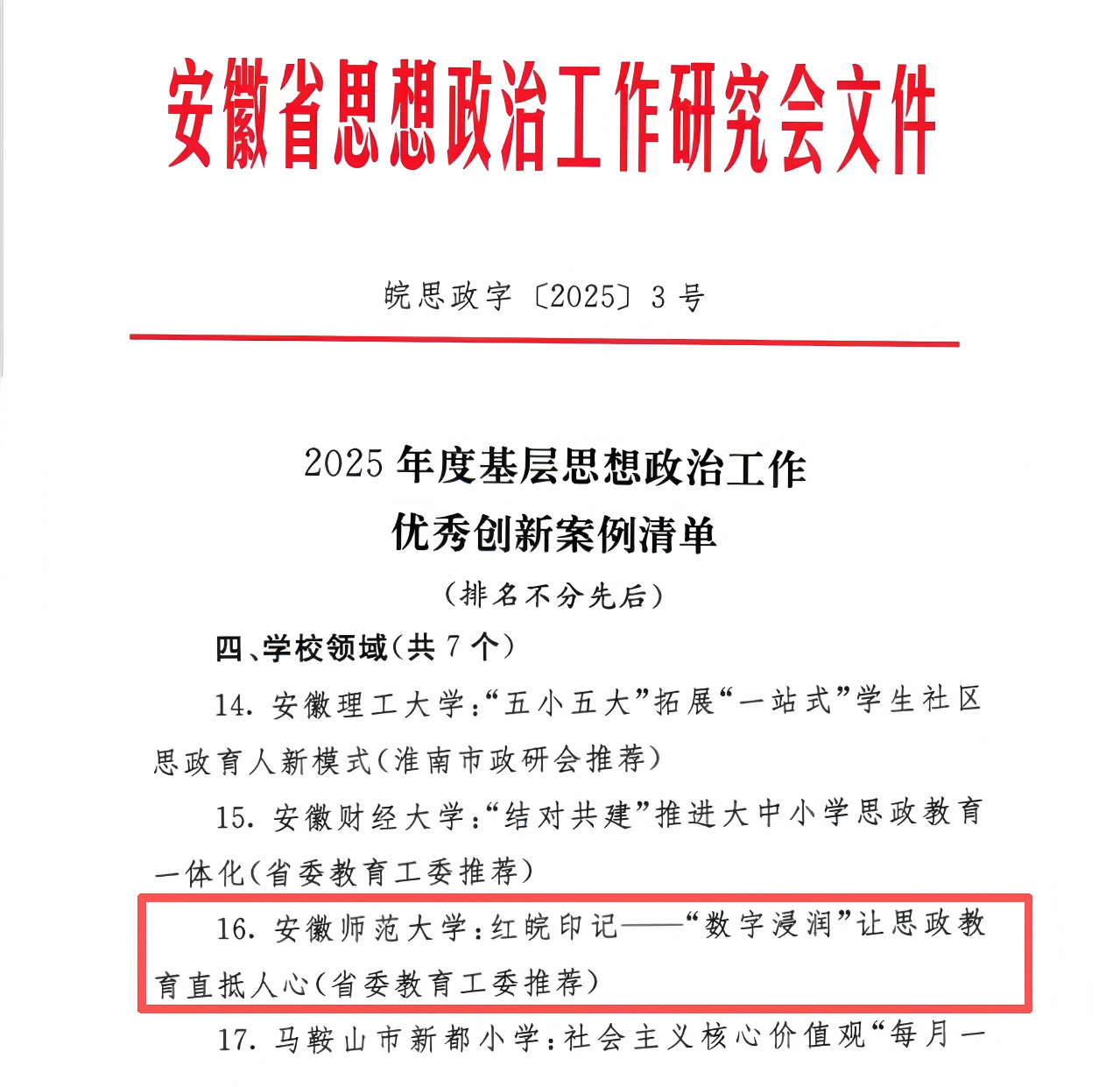 近日,安徽省思想政治工作研究会公布2025年基层思想政治工作创新案例征集结果,全省教育系统共7个案例入选,计算机与信息学院申报的“红皖印记——‘数字浸润’让思政教育直抵人心” 案例作为我校唯一入选案例,成为全省基层思政工作创新的典型代表。