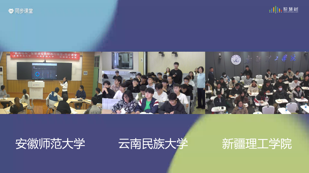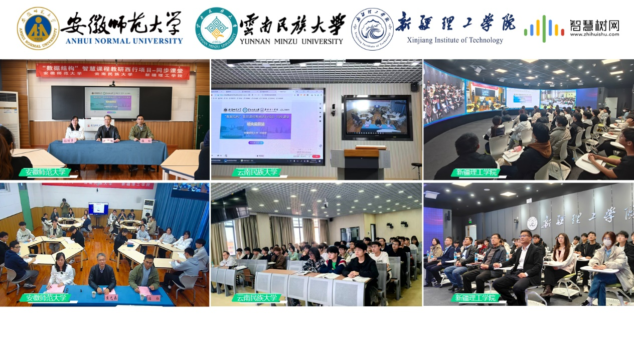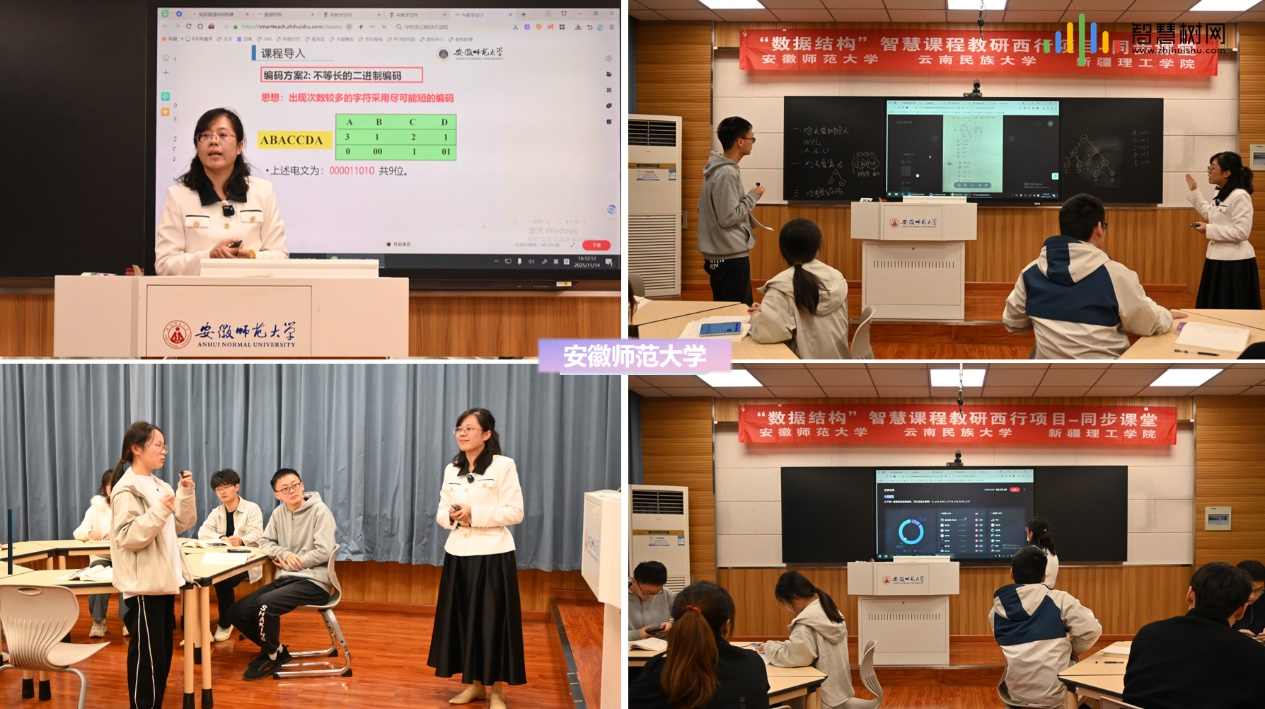 11月14日,安徽师范大学、云南民族大学与新疆理工学院联合开展“智慧课程教研西行-同步课堂”活动。活动依托国家级一流本科课程《数据结构》,聚焦“哈夫曼算法”核心知识点,通过智慧树平台实现三校师生实时互动、同步研讨与在线评测。本次活动在安徽师范大学行知楼507教室设立主会场,云南民族大学丰华苑C309教室与新疆理工学院全景教室同步接入。安徽师范大学本科生院院长崔光磊、计算机与信息学院院长接标、副院长孙丽萍,云南民族大学数学与计算机科学学院副院长蒋作、副教授芦俊丽,新疆理工学院教务处副处长王喜军、信息工程学院副院长霍建建、副院长郭斌、副教授陈蒙、教师沈文胜出席启动仪式,三校学生代表共同参加。