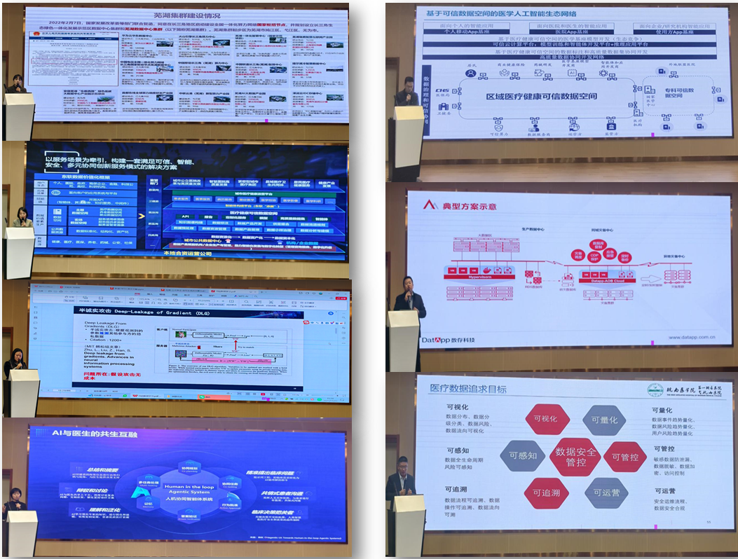 第二阶段为专题研讨交流。芜湖市大数据建设投资运营有限公司党支部书记、董事长胡蓉介绍了芜湖依托 “东数西算” 战略打造的 “四算合一” 算力统筹调度平台及公共数据授权运营的 “芜湖模式”。东软集团智慧城市研究院资深咨询顾问韩春香介绍了数据驱动下智慧医疗 AI 在城市级全场景的落地路径。华中科技大学助理教授张晓阐述了可信联邦学习在医疗场景中的理论构建。卫宁健康科技集团行业咨询总监朱丹丹介绍了 AI 技术在病历质控、影像报告生成、院感预警等临床场景的落地应用。北京大学(滨海新区)新一代信息技术研究院医疗健康大数据中心胡为松交流了参与国家可信数据空间标准编写的经验。深圳市数存科技有限公司产品中心总经理雷成荣分享了医疗信息系统连续服务能力建设的实践经验。皖南医学院第一附属医院(弋矶山医院)的刘冬深入剖析了数据要素时代医疗数据安全面临的挑战与应对策略。