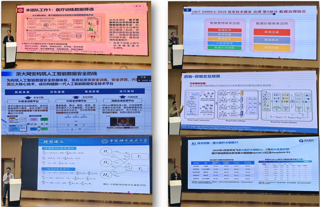 研讨会第一阶段为学术报告分享,内容覆盖医疗大模型、智能影像、公共卫生建模等核心领域。北京大学王亚沙教授以《医疗垂域大语言模型的实践与思考》为题,分享了脑影像动态因果网络、遗传影像学等先进技术在精神疾病诊断中的应用,其研发的预测模型为抑郁症、精神分裂症等疾病提供了客观信息学指标。华中科技大学同济医学院沈丽宁教授以《医疗数据治理与资产化 —— 从数据资源到数据资产的跃迁路径》为题,解析 IT 生态演变、数据管理能力成熟度评估模型、数据质量举措与障碍、卫生健康信息标准体系等关键要点,为医疗数据从资源到资产的转化提供理论与实践指引。浙江大学秦湛教授以《大模型时代人工智能安全与评测》为题,介绍团队在人工智能安全训练、安全评测、深度合成检测等方面的工作进展,助力人工智能数据安全与深度合成内容治理。安徽医科大学王梓副教授以《多模态数据挖掘方法及其医学应用》为题,介绍应对信息不完备挑战的完整性信息恢复、多样性表示学习方法,缓解领域分布差异和模态知识差异的策略,为多模态数据挖掘在医学领域的应用提供方法与思路。中国科学技术大学胡茂彬副教授以《交通驱动流行病扩散的建模和控制》为题,介绍团队在交通与流行病扩散交叉领域的相关研究进展,通过元种群网络、多重网络等模型构建,揭示人群流动对流行病扩散的影响机制,为公共卫生防控提供量化决策依据。讯飞医疗科技股份有限公司副总裁刘洋以《人工智能和数据要素驱动医疗智慧化应用》为题,展示了依托讯飞星火医疗大模型的智医助理在全科辅诊、专科辅诊、体检报告解读等场景的应用成果,及其在权威医疗大模型评测中的领先表现。