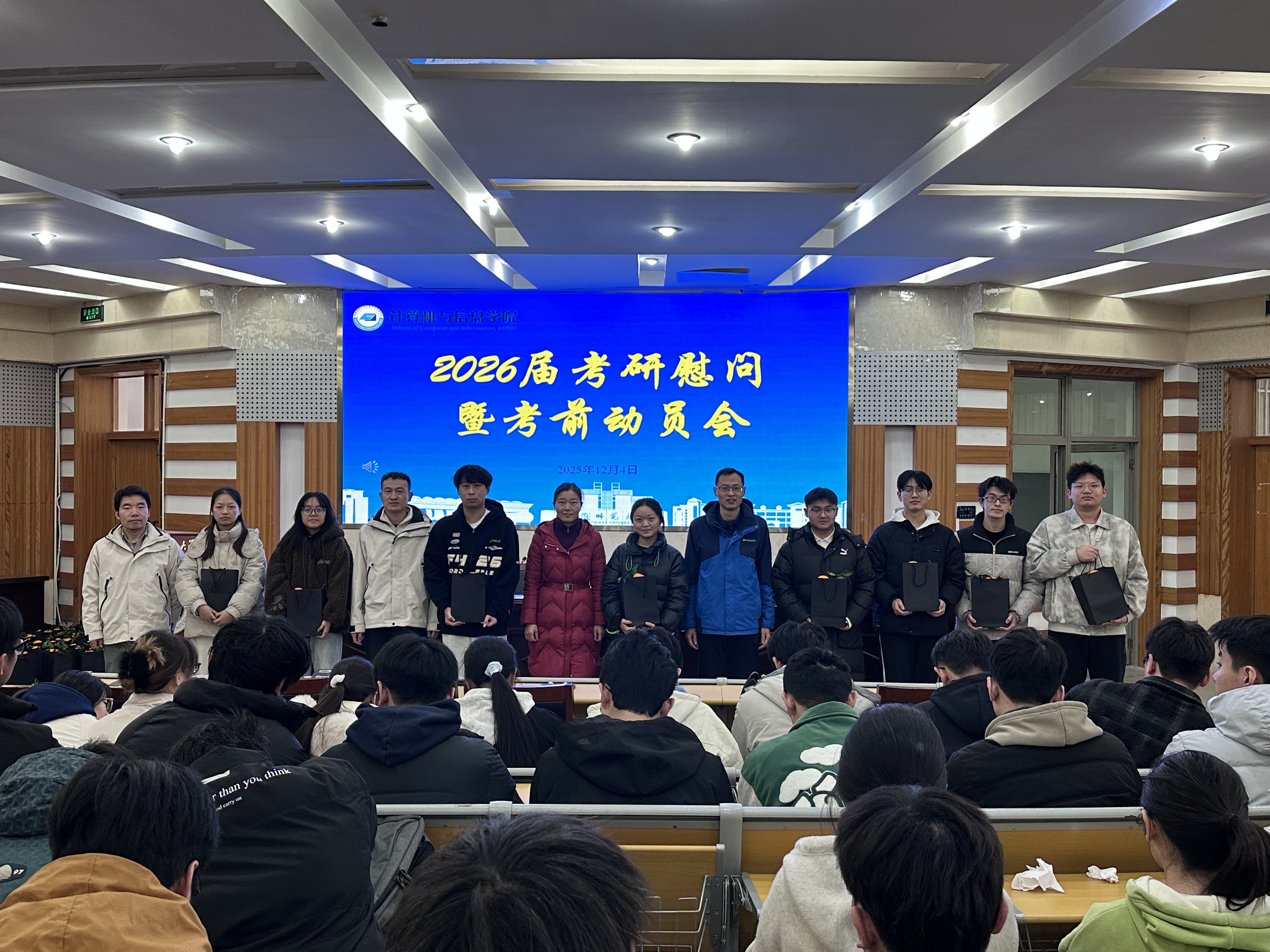 12月4日下午,计算机与信息学院在学苑北楼8号楼副2楼报告厅举行2026届考研慰问与考前动员会,为学子冲刺助力,用关怀温暖寒冬。学院党委书记张园园、党委副书记安广虎、院长助理兼数据科学与技术系负责人郑孝遥、毕业班辅导员及2026届考研学生共同参会。会议由学院党委副书记安广虎主持。