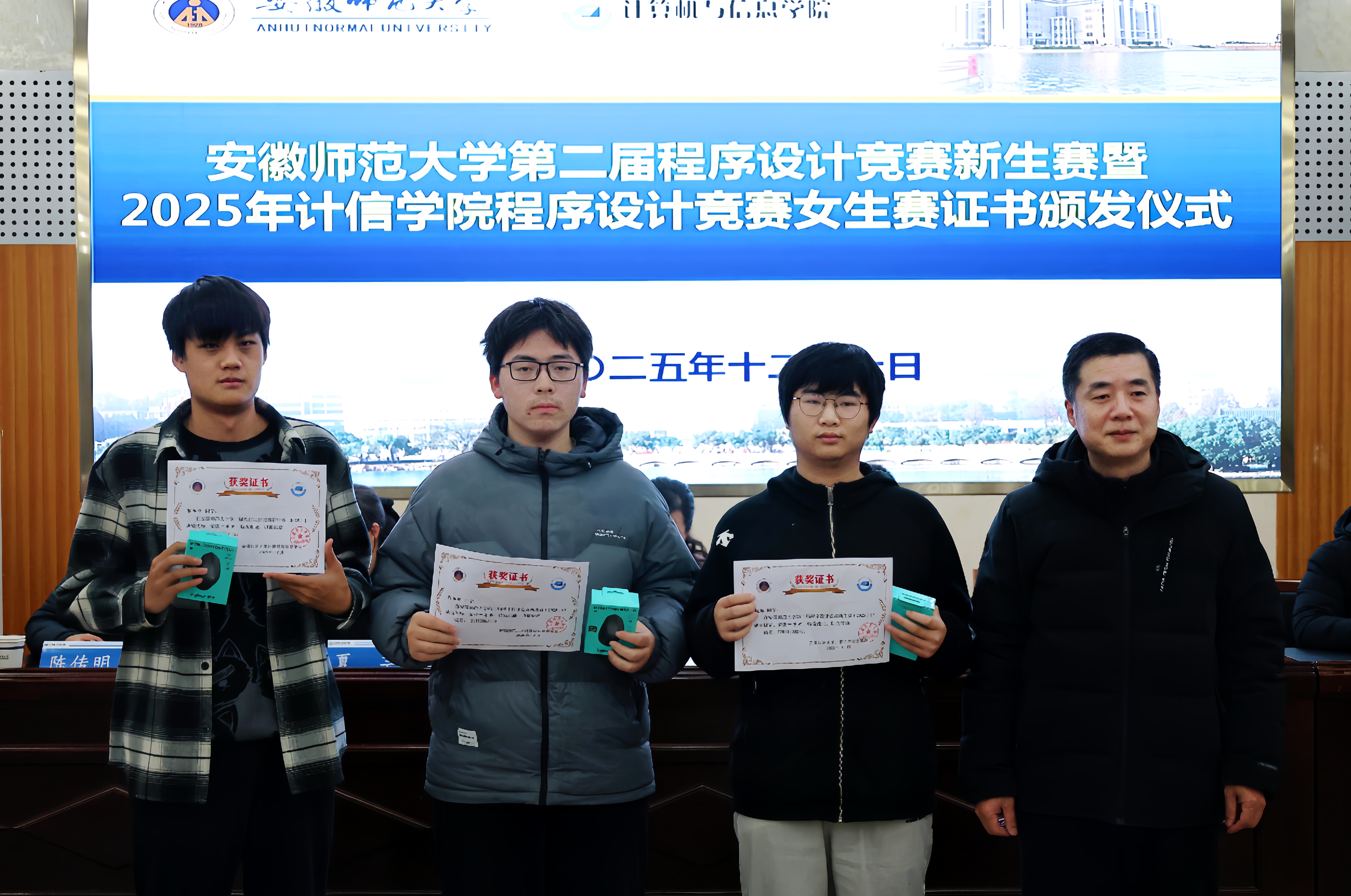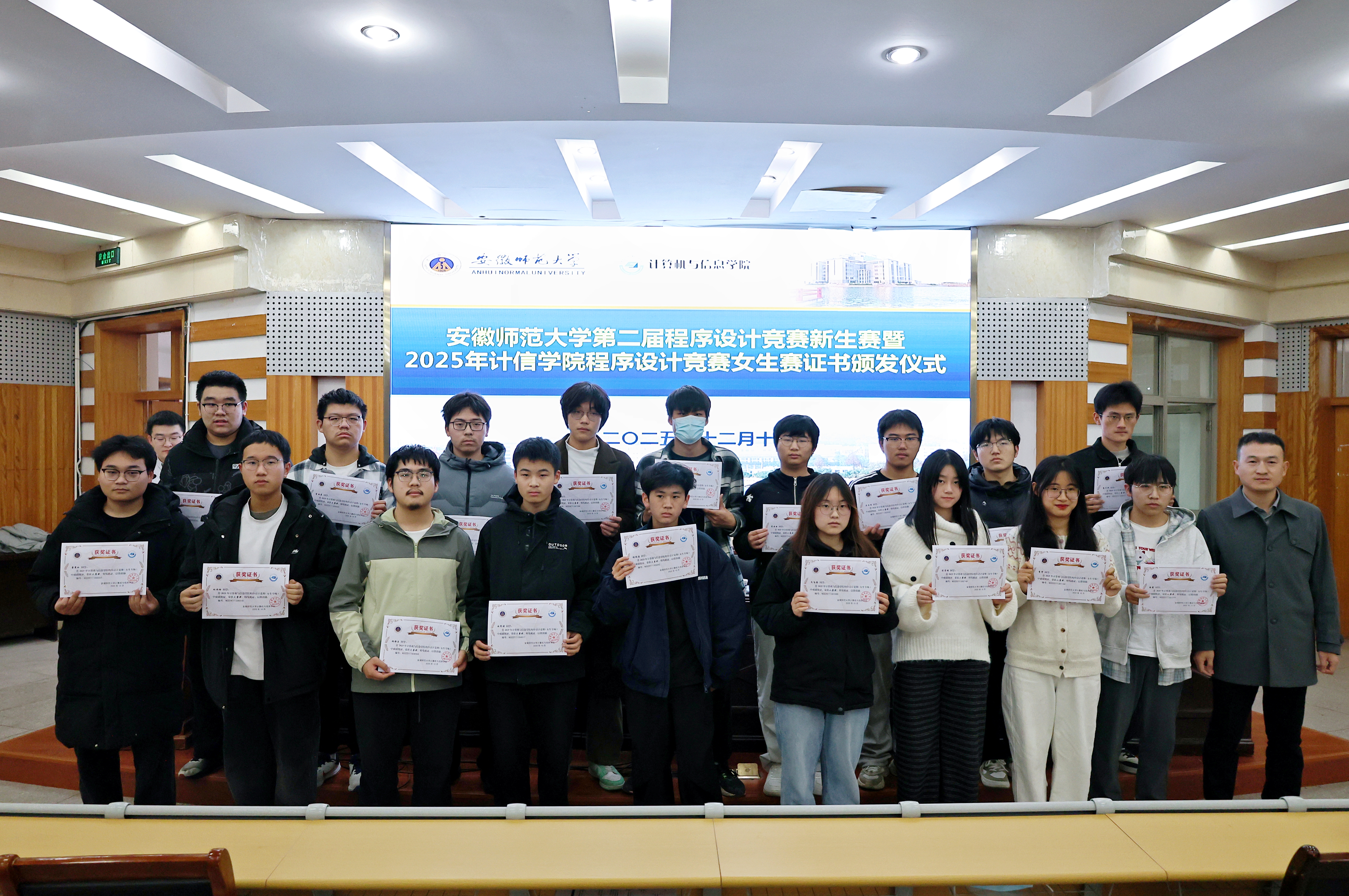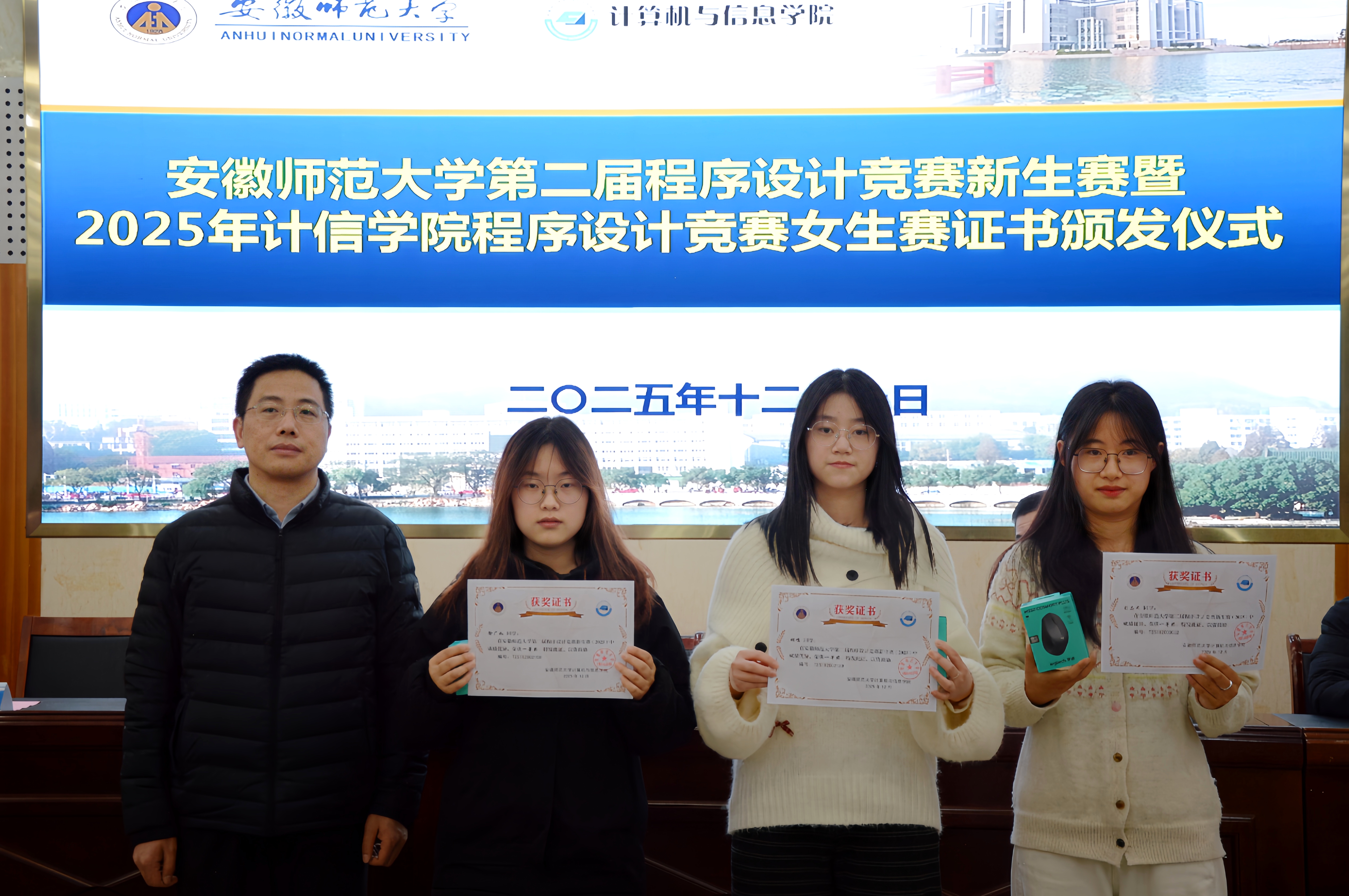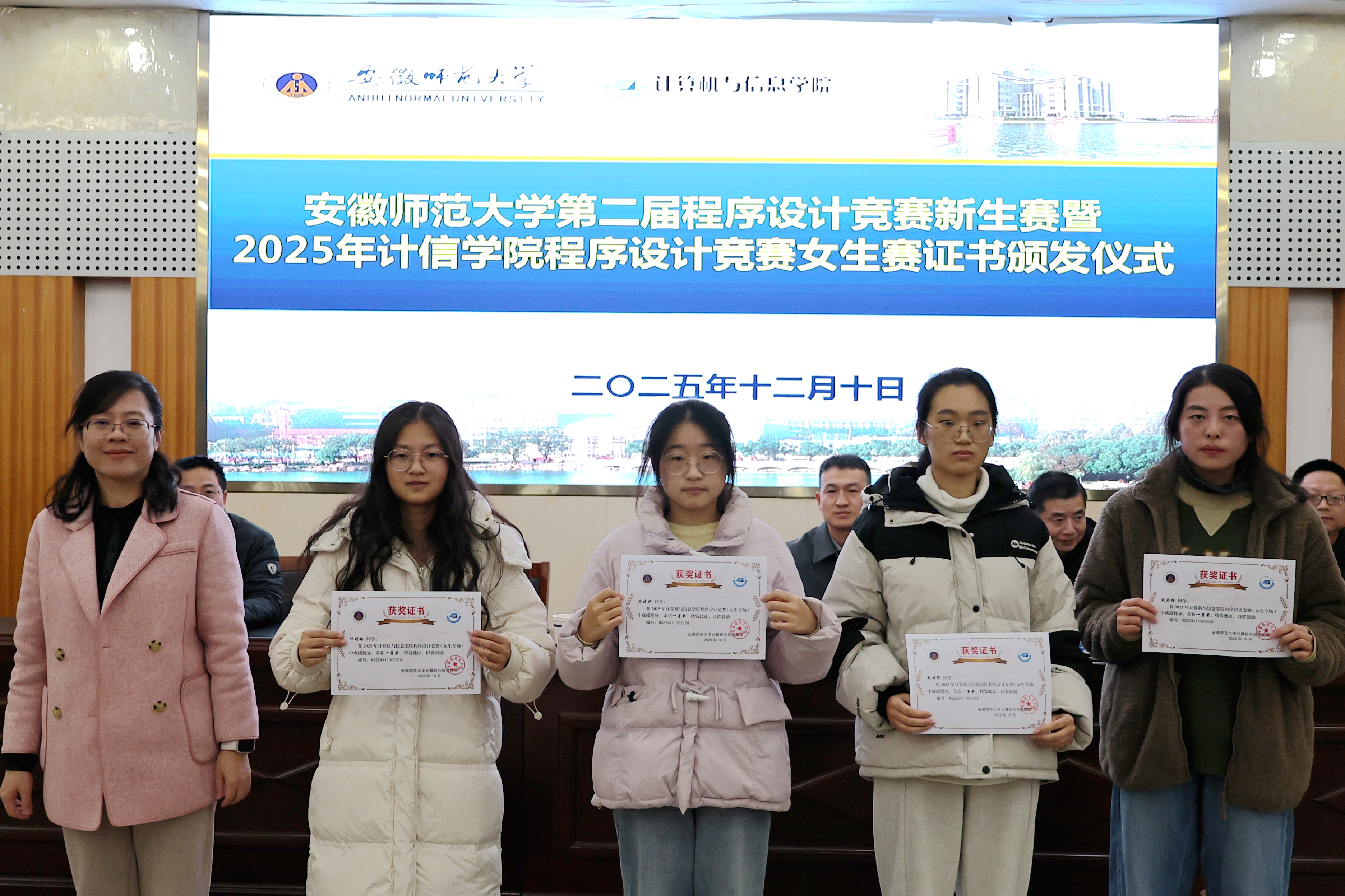 12月10日下午,安徽师范大学第二届程序设计竞赛新生赛暨2025年计信学院程序设计竞赛女生赛证书颁发仪式在学苑北楼8号楼副二楼报告厅举行。计算机与信息学院党委副书记安广虎,教学副院长孙丽萍,指导老师李杰、陈传明、夏芸、赵诚出席仪式。仪式由辅导员姚良飞主持,全体获奖学生参加仪式。