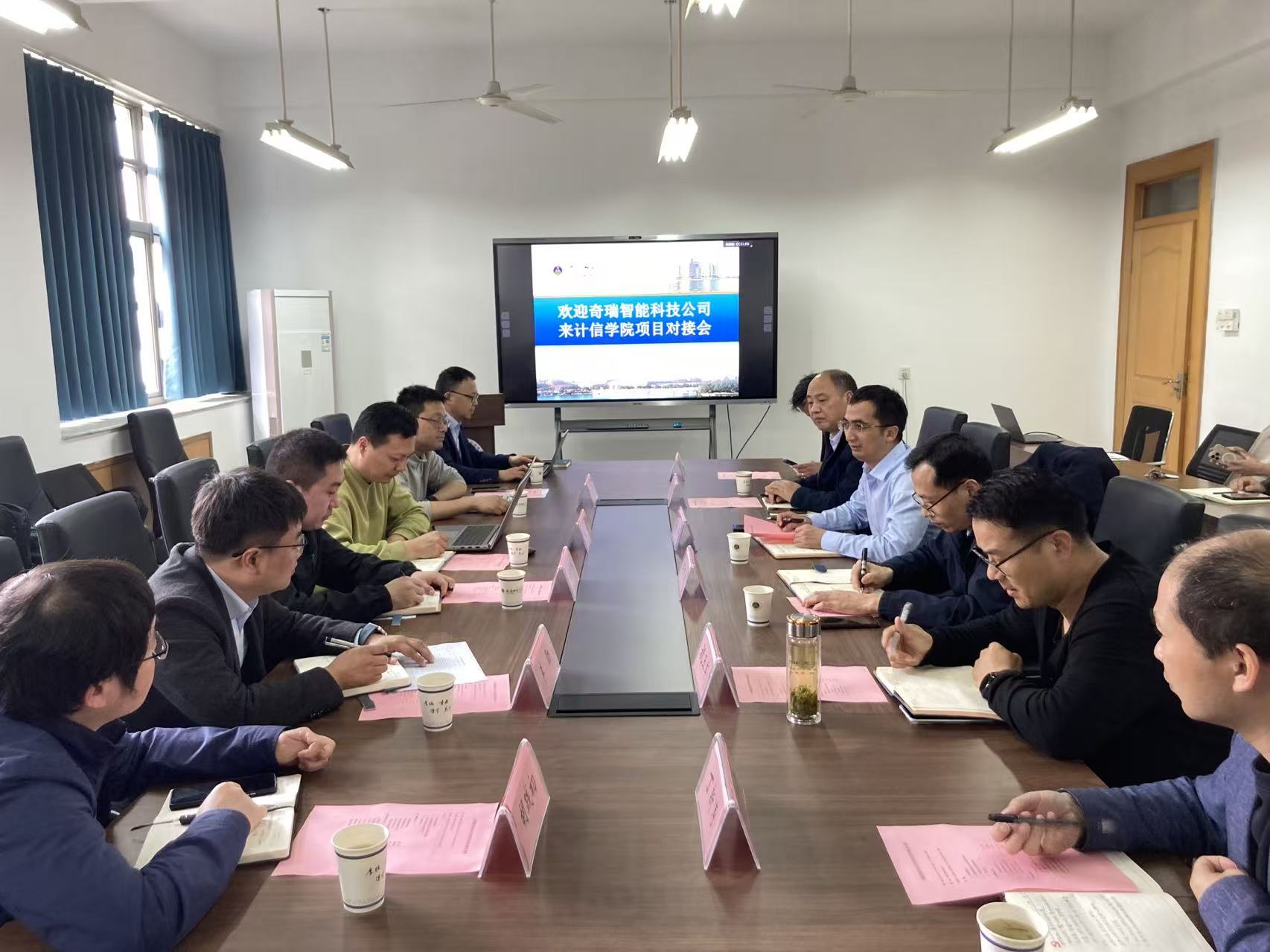 本网讯(计信学院 詹越)为深化校企合作、推动产学研深度融合,助力智能科技领域技术创新与人才培养,2026年4月10日下午,计信学院与奇瑞智能科技公司项目对接会在学苑北楼7#308会议室举行。计信学院院长接标首先致欢迎辞,详细介绍学院学科建设、科研水平、人才培养及产学研合作成果。他表示,学院将以此次对接为契机,与企业开展深度合作,实现资源共享、优势互补。