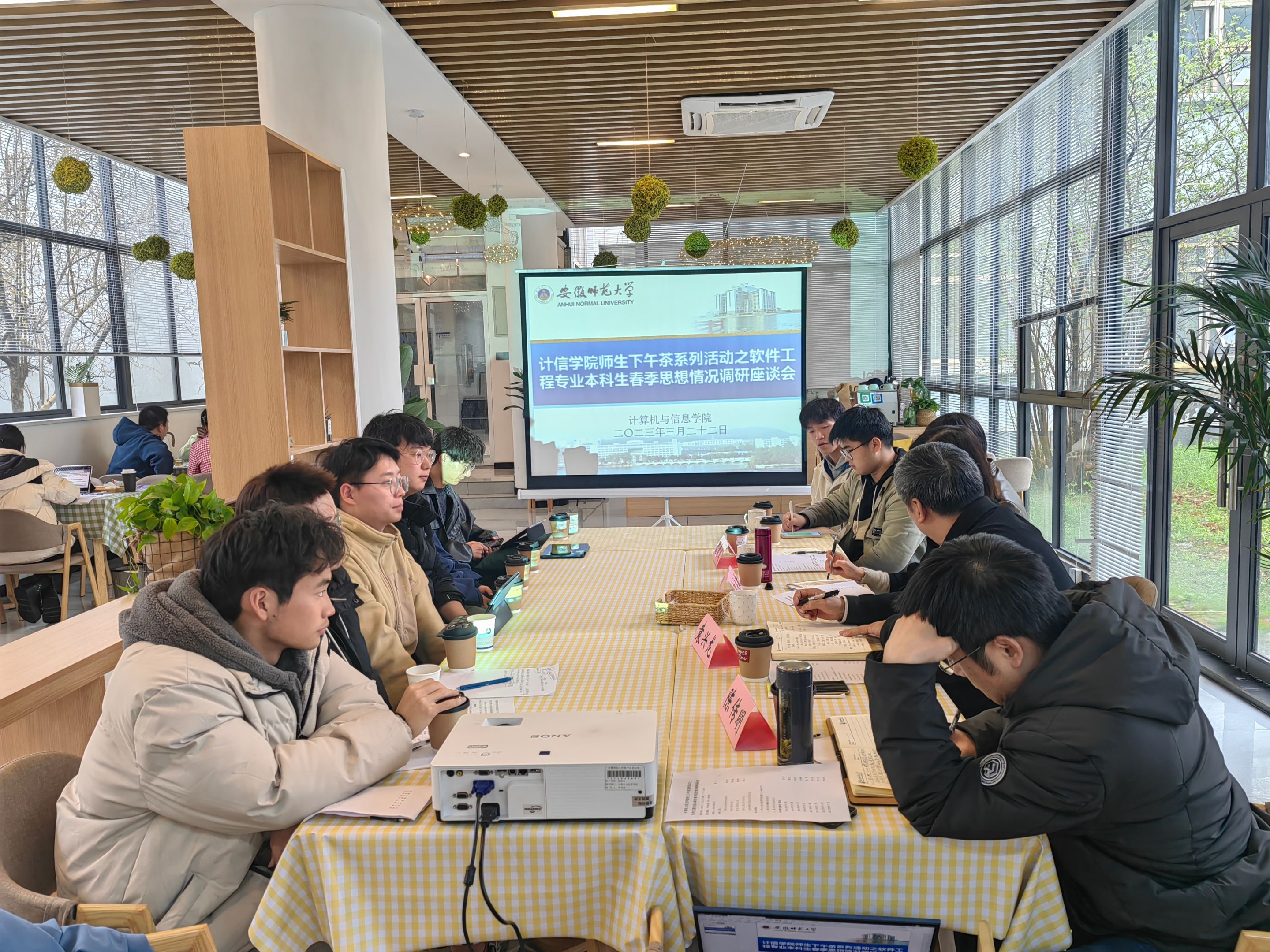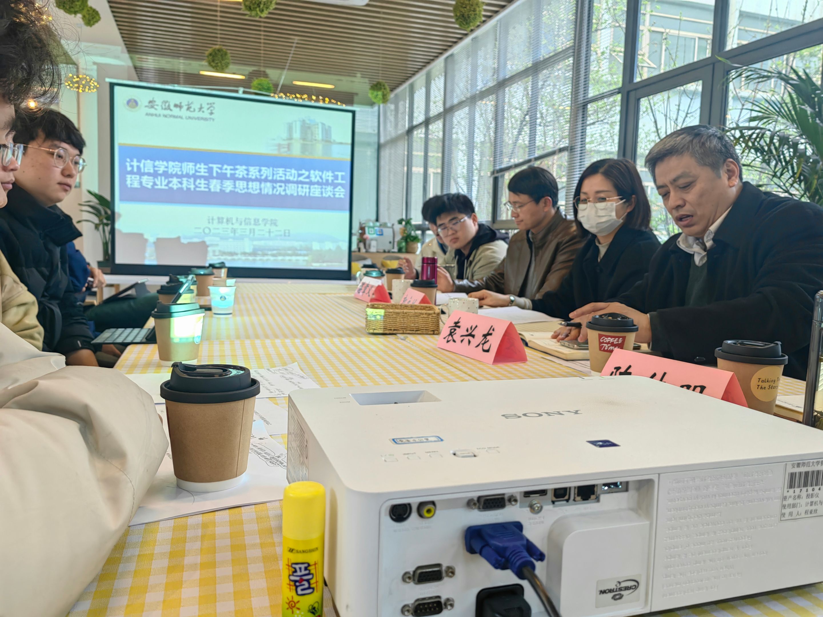 本网讯(计信学院 王赛奇)为更好的服务学院学子,引领学生成长进步,加强和改进大学生思想政治工作,贯彻中央大兴调研工作部署精神,落实省委持续推进“一改两为”要求,学院决定建立深入师生调研常态化机制,定期开展“师生下午茶”活动。3月22日下午,“师生下午茶”首期活动在计信梦工坊顺利举办。本期主题围绕软件工程专业本科生春季思想情况调研展开,党委书记袁兴龙、软件工程系主任郭良敏、系副主任陈传明、系骨干教师代表谌章义受邀担任首期活动嘉宾。活动由2020级辅导员曹活主持。