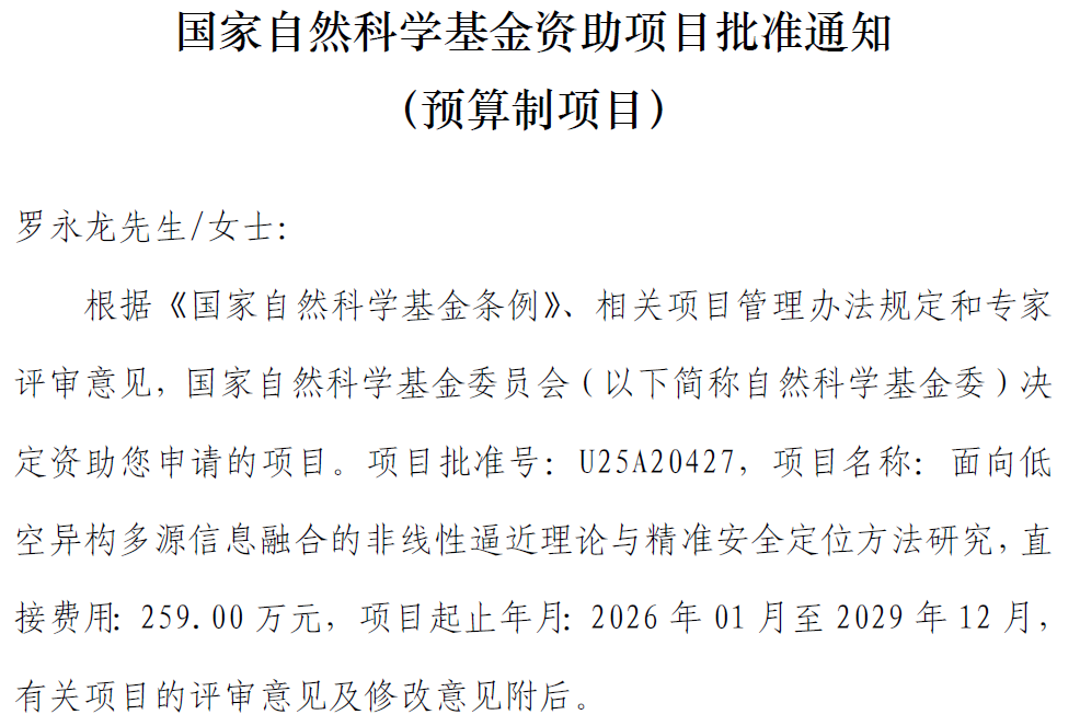 近日,我院罗永龙教授牵头申报的国家自然科学基金联合基金重点项目—“面向低空异构多源信息融合的非线性逼近理论与精准安全定位方法研究”正式获批,标志着我校在低空智联网核心技术研究领域迈出重要一步。