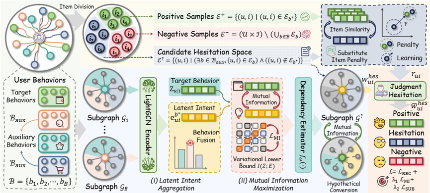 多行为推荐通过融合多样化辅助交互丰富用户偏好建模,但现有方法大多简单将非目标行为交互视作绝对负反馈。该策略忽略了用户犹豫这一关键中间状态 —— 用户已展现强烈交互意图,却因各类原因未完成最终转化,导致模型无法区分真实无兴趣与高意图犹豫行为,为偏好建模引入大量噪声。针对这一核心问题,团队提出全新框架CHARM:首先将导向成功转化的辅助行为聚合为潜在意图表征,通过最大化意图与观测目标行为间的互信息训练推理网络;在假设转化发生的前提下,将网络应用于未转化辅助行为,推理潜在转化概率并识别高意图犹豫样本。此外,为区分真实犹豫与竞品选择导致的交互终止,团队设计竞争者替代惩罚策略细化犹豫置信度得分,最终将校准后的犹豫集融入推荐流程,显著提升排序质量。在三个真实世界数据集上的大量实验表明,CHARM 模型持续优于现有主流 SOTA 方法,充分验证了框架的有效性与先进性。