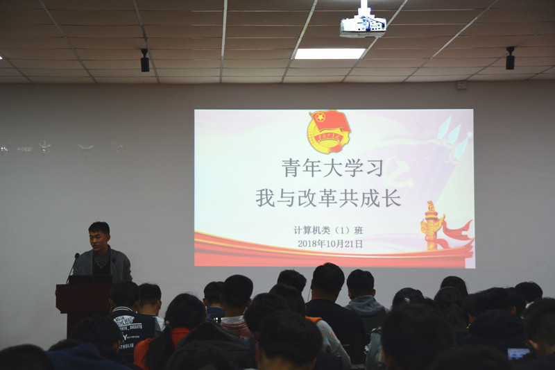 (本网讯 葛晓莲)为引导广大团员青年回顾改革开放四十年来走过的伟大历程和取得的巨大成就,展示青年蓬勃向上的精神风貌,凝聚起实现伟大中国梦的青春力量10月21日晚,2018级计算机类(1)班在学苑楼1号楼105教室开展了“青春大学习 我与改革共成长”主题团日活动。活动由侯翔宇同学主持,全体同学共同参与。